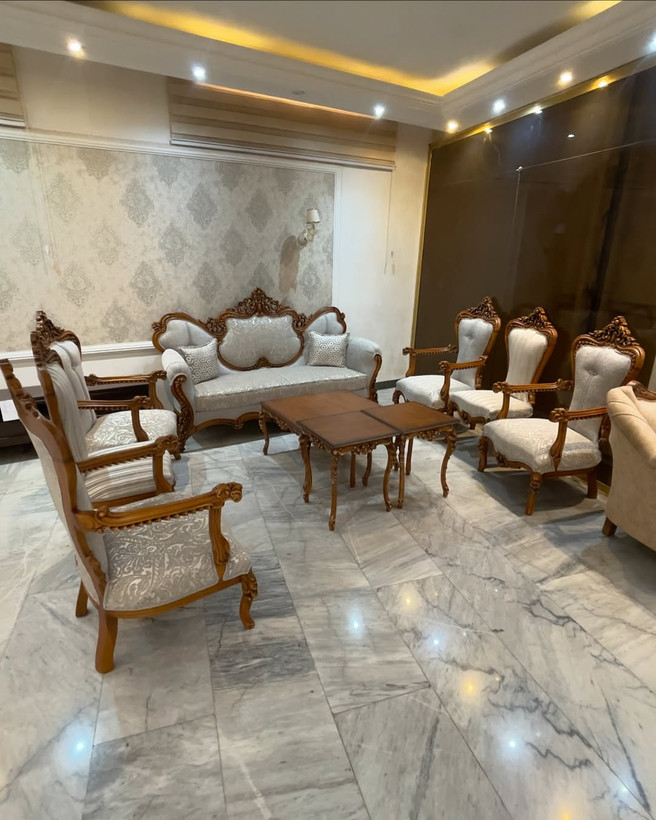 سرویس مبل فره نگین شامل: ۱ کاناپه | ۴ مبل تک | ۲ عدد میزبان • پارچه به انتخاب شما چوب راش با کیفیت بالا، طراحی خاص و شیک