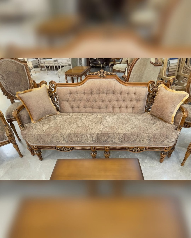 مبل ۹نفره مصری، شکوه و اصالت در کنار راحتی! شامل: یک کاناپه، ۴ مبل تک نفره، و ۲ صندلی لاکچری چوب درجه یک، پارچه و رنگ به انتخاب شما!